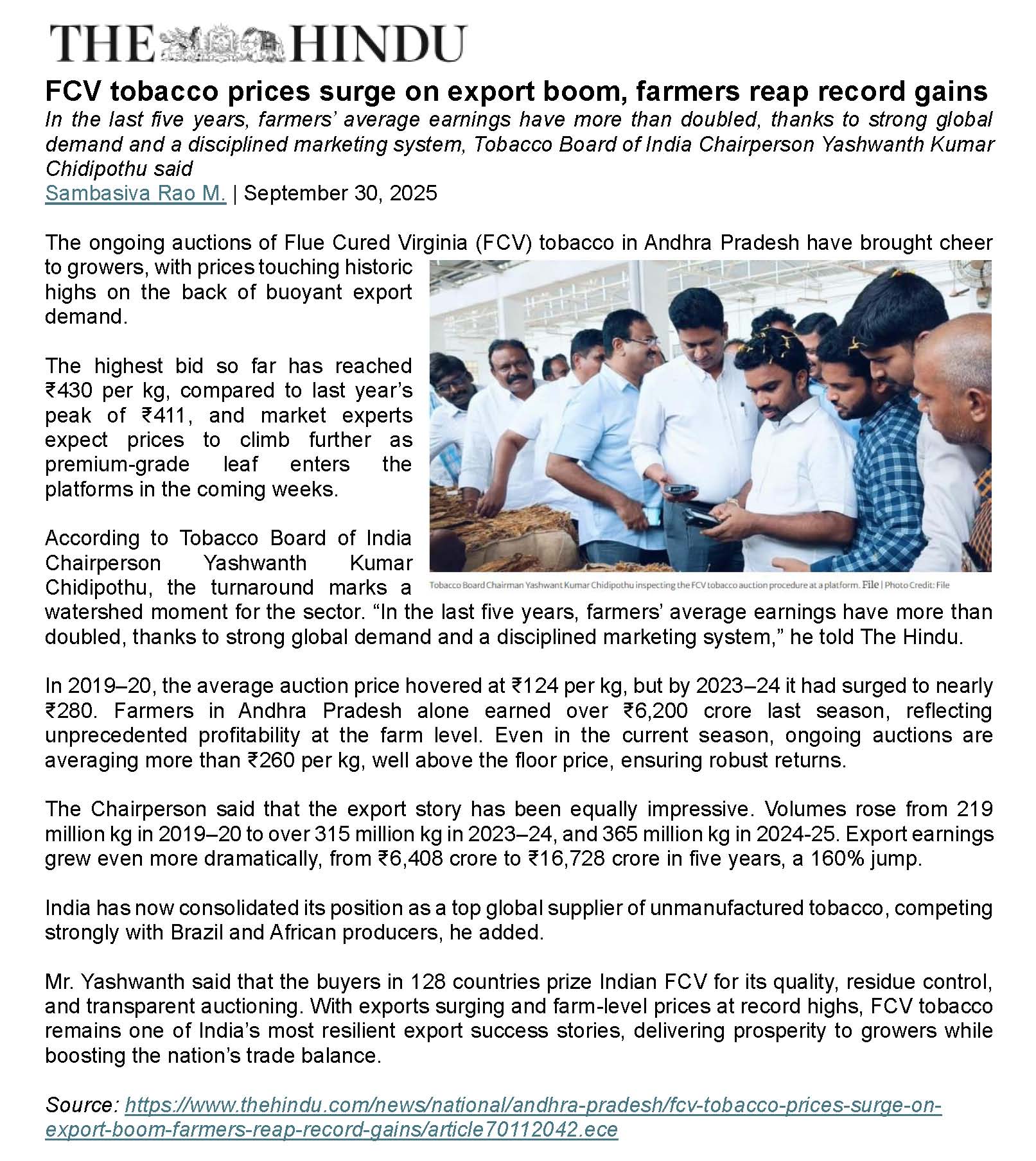 Flue Cured Virginia (FCV) tobacco is the main exportable tobacco produced in India. FCV tobacco exports alone garner foreign exchange earnings of around Rs. 7,552 crores annually (2024-25).
